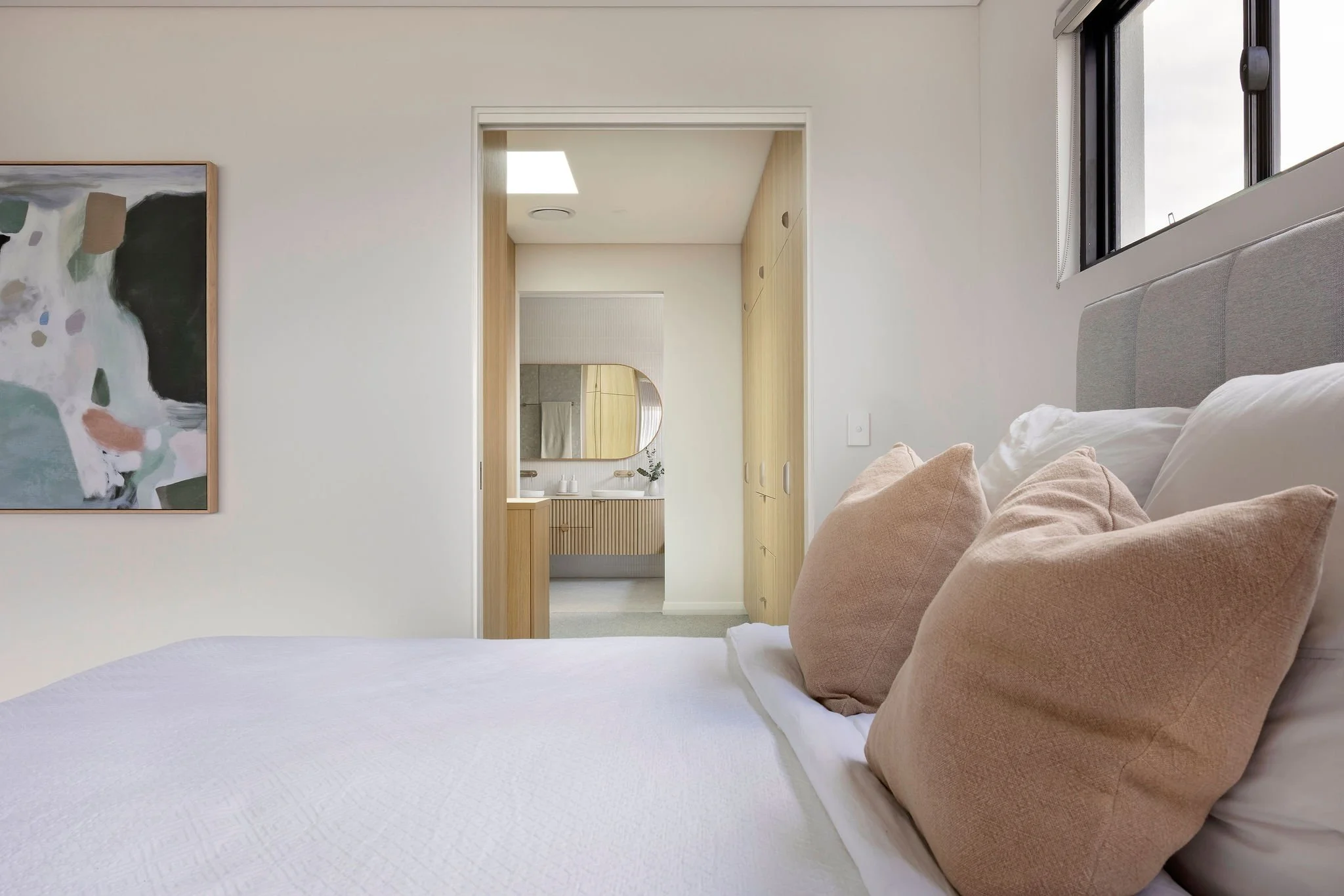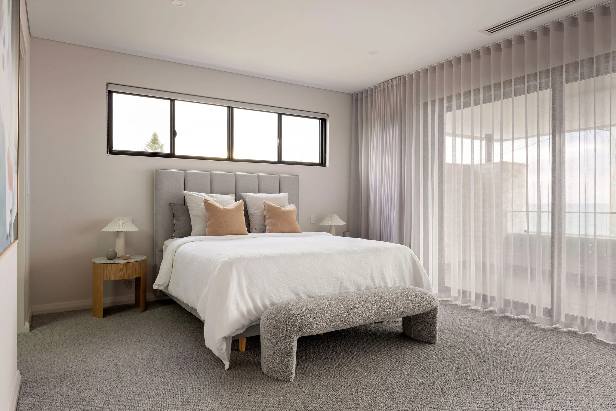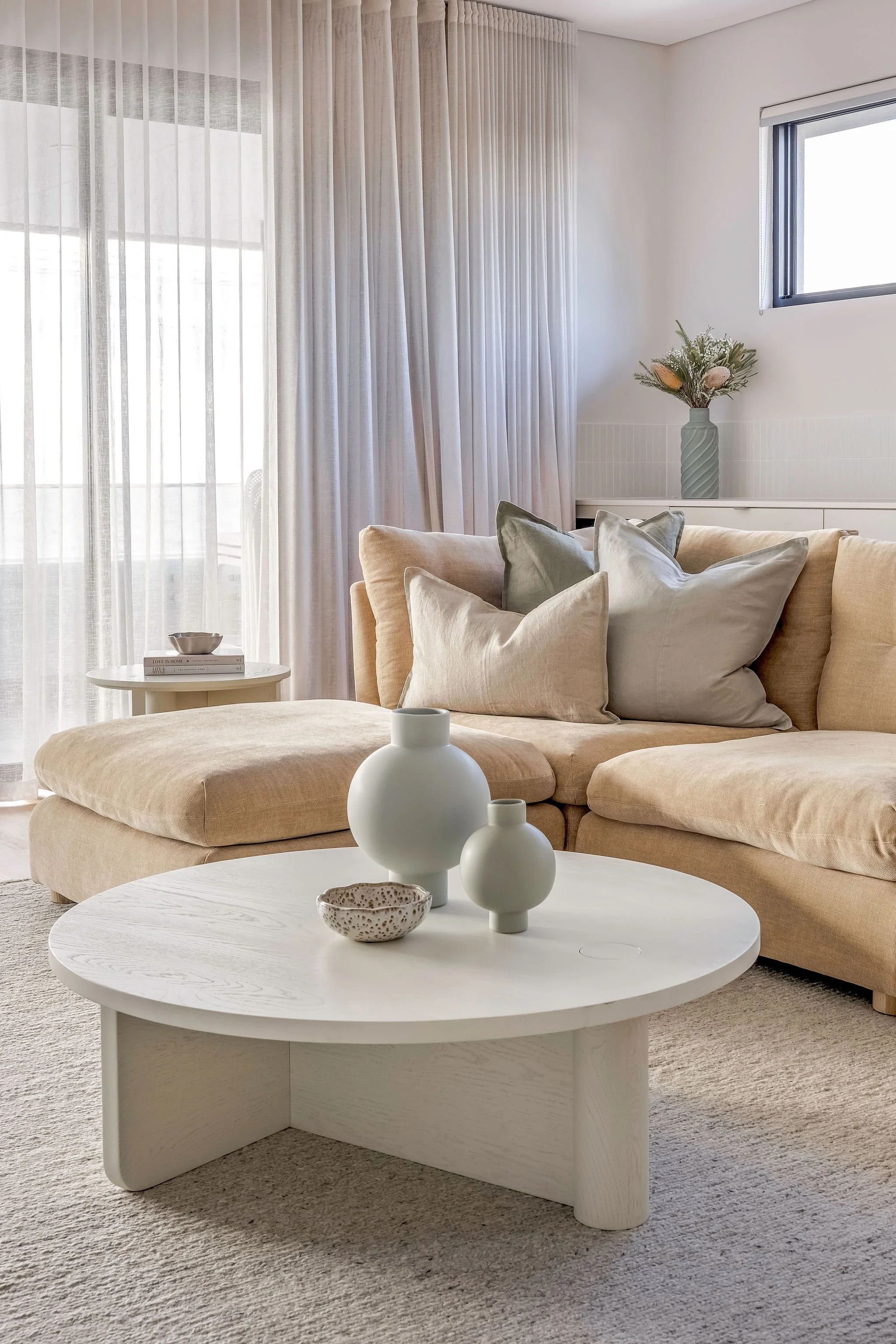 Our scope included the full interior design for the build, as well as furniture selection, styling, and artwork curation. Each element was chosen to reflect the home's peaceful setting and ocean views, enhancing the retreat-like feel throughout. Every room was designed for everyday living, with generous built-in storage to ensure functionality and flow without compromising the calm, uncluttered vibe.