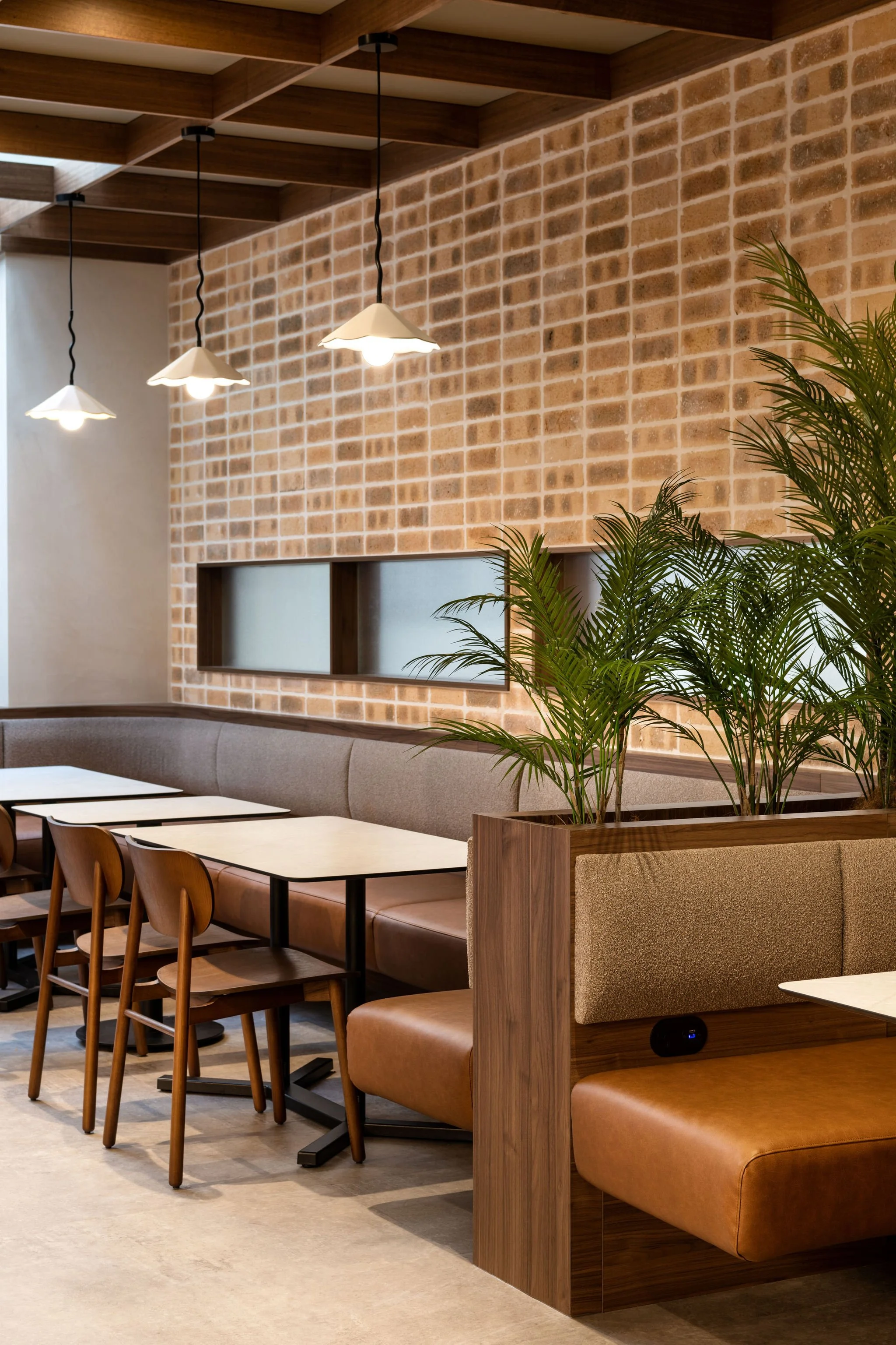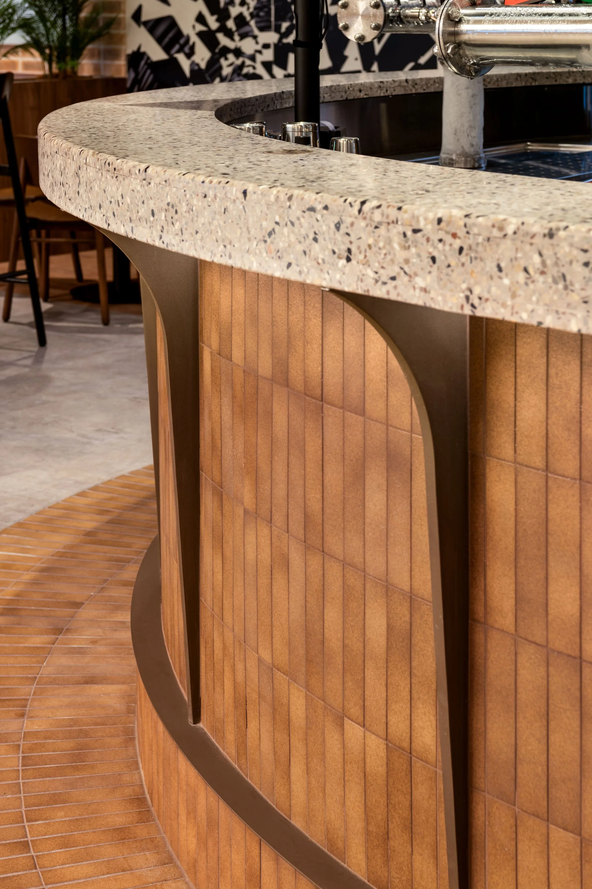 Urbani design was engaged by Delaware North, to design The Social at Perth International Airport, a contemporary café and bar, combining hospitality expertise with retro-inspired interiors. The project features a curved central bar with terrazzo tops and earthy tiles, cozy banquette and booth seating with textured fabrics and retro vinyl, layered materials including walnut timber, brick walls, and olive-green accents.