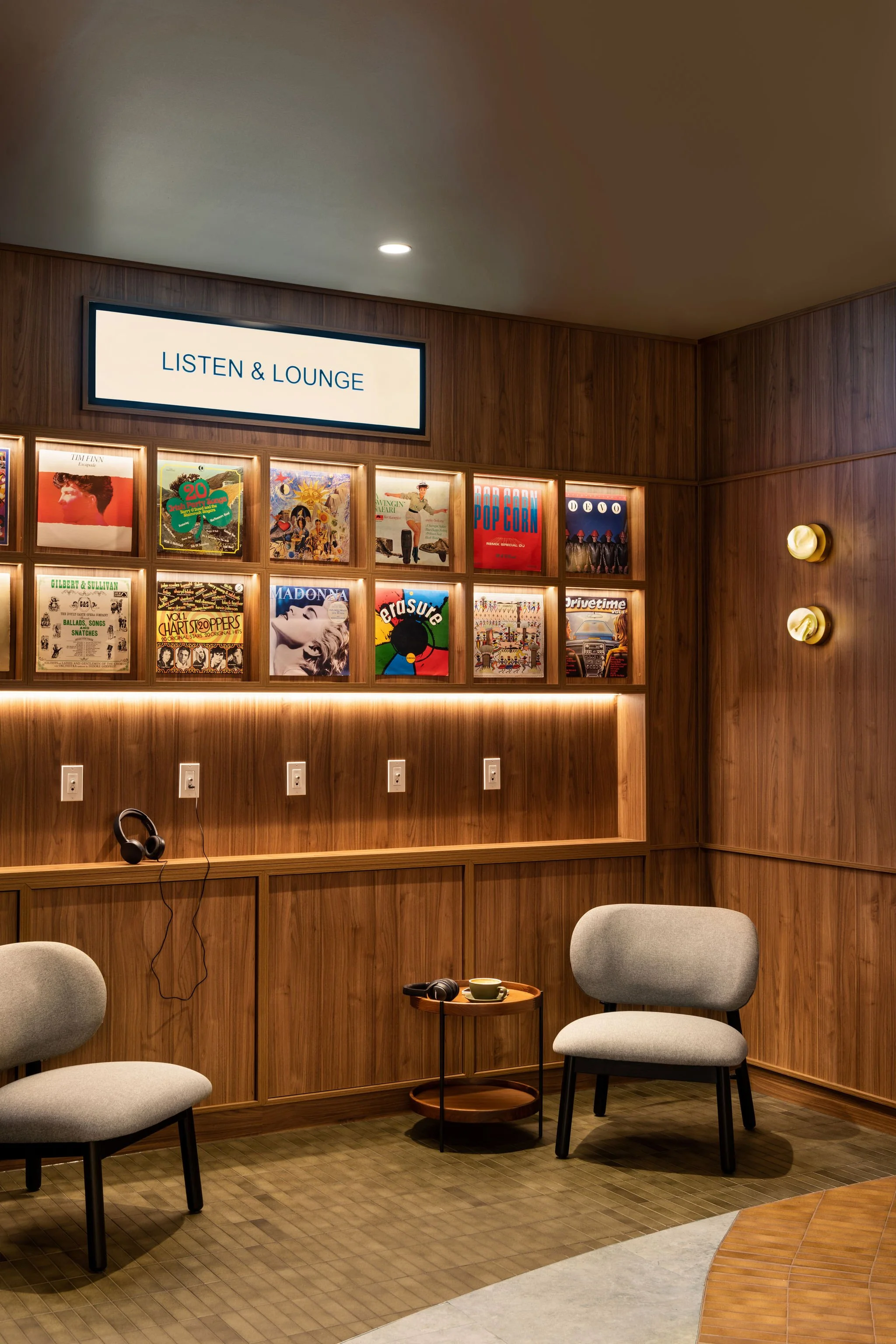 Key zones include a café counter with integrated merchandising, a bar area with timber screens and hanging greenery, a live music space, and a ‘Listen & Lounge’ area with illuminated vinyl displays and headphone stations.